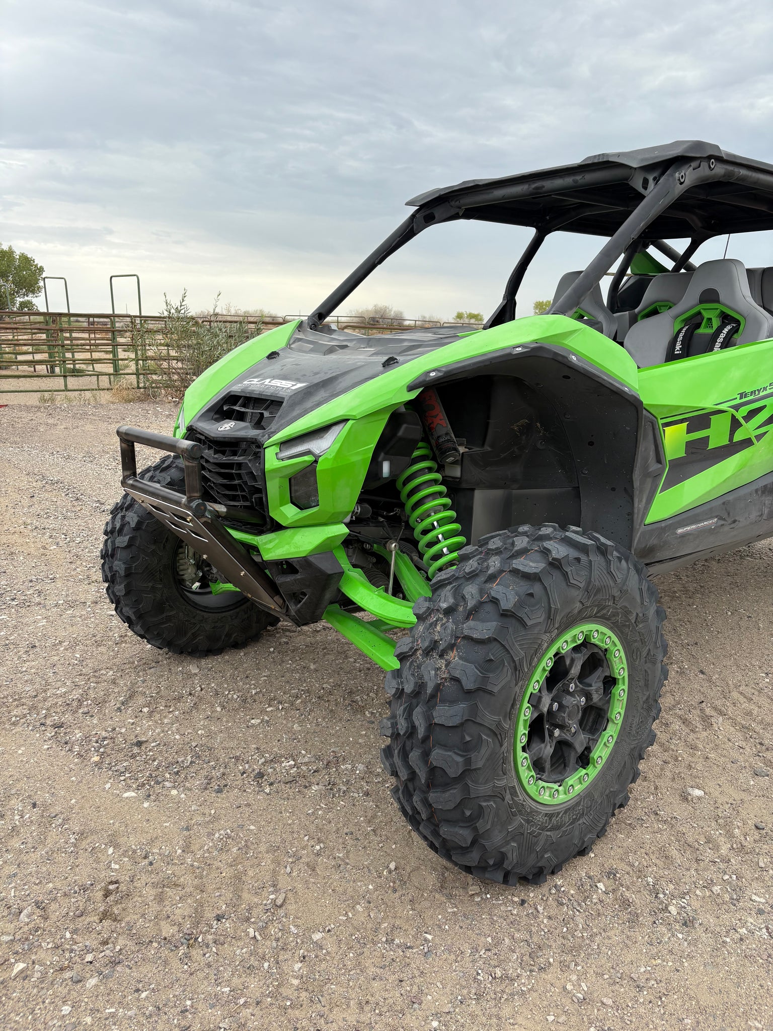 Check out our race legal front bumper for the Kawasaki Teryx H2, it is long enough to pass tech(BITD, VORRA, DP4, SCORE) with 35" tires. It’s constructed from CNC laser cut 1.5"x.095 and 1.25"x.095 DOM tubing and is completely TIG welded. Includes 1/8" aluminum skid plate. Bumper bolts to the sway bar mount and factory lower bumper holes in chassis. It does require minor trimming of the grill to fit.
